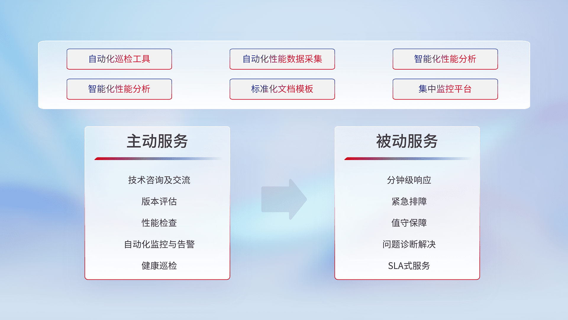 智能化工具和标准化文档,,,,保障服务质量,,,,提供主动服务(包含技术咨询、、、版本评估、、性能检查、、、自动化监控与告警、、、、健康巡检)和被动服务包含(分钟级响应、、、紧急排障、、、、值守保障、、、、问题诊断解决、、、SLA服务)。。